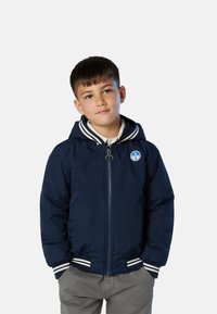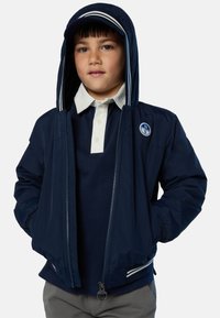 Giubbotto bomber blu navy con rifiniture bianche, polo blu navy, pantaloni grigi, scarpe da ginnastica bianche e cappellino blu navy con logo. Ragazzo giovane in piedi con le mani nelle tasche.