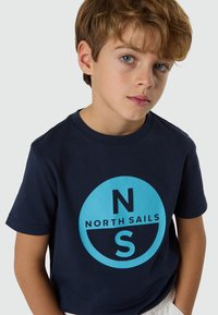 Ragazzo giovane in piedi con le mani in tasca, indossa una maglietta blu navy North Sails, pantaloni bianchi e sneakers bianche su sfondo semplice.