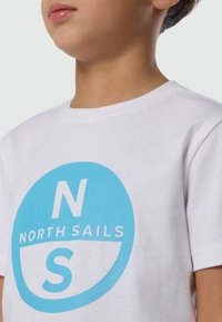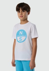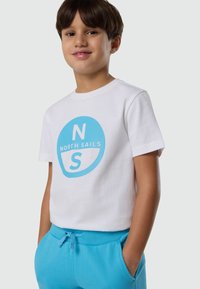 Ragazzo giovane in piedi con le mani nelle tasche, indossa una maglietta bianca North Sails, pantaloncini azzurri, calzini bianchi e scarpe da ginnastica bianche.