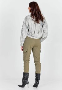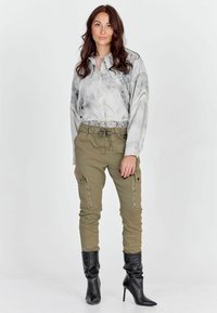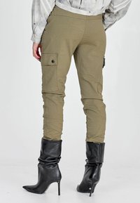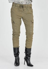 Pantaloni cargo verde oliva con cintura elastica, coulisse, zip laterali e due tasche cargo, abbinati a stivali neri con tacco alto.