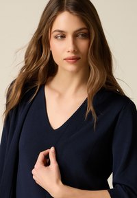 Donna con capelli lunghi e mossi indossa una maglia a scollo a V blu navy e un cardigan abbinato con jeans azzurri, in piedi davanti a uno sfondo beige.