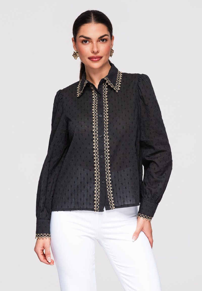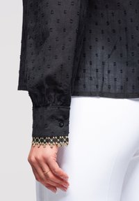 Donna che indossa una camicetta nera a maniche lunghe con rifiniture dorate su colletto, davanti e polsini, abbinata a pantaloni bianchi, su uno sfondo chiaro e uniforme.