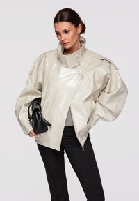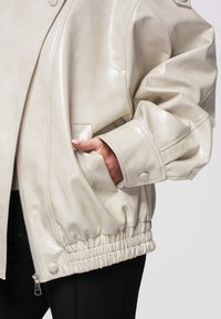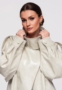 Donna con giacca in pelle color crema oversize con colletto alto, bottoni ed orlo elastico, in posa con una mano vicino al viso e l'altra in tasca.