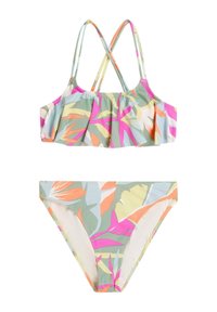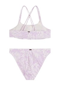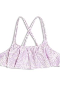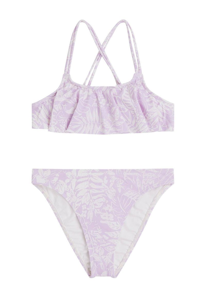 Bikini due pezzi viola con top arricciato e spalline incrociate, caratterizzato da un motivo floreale bianco su un tessuto strutturato.