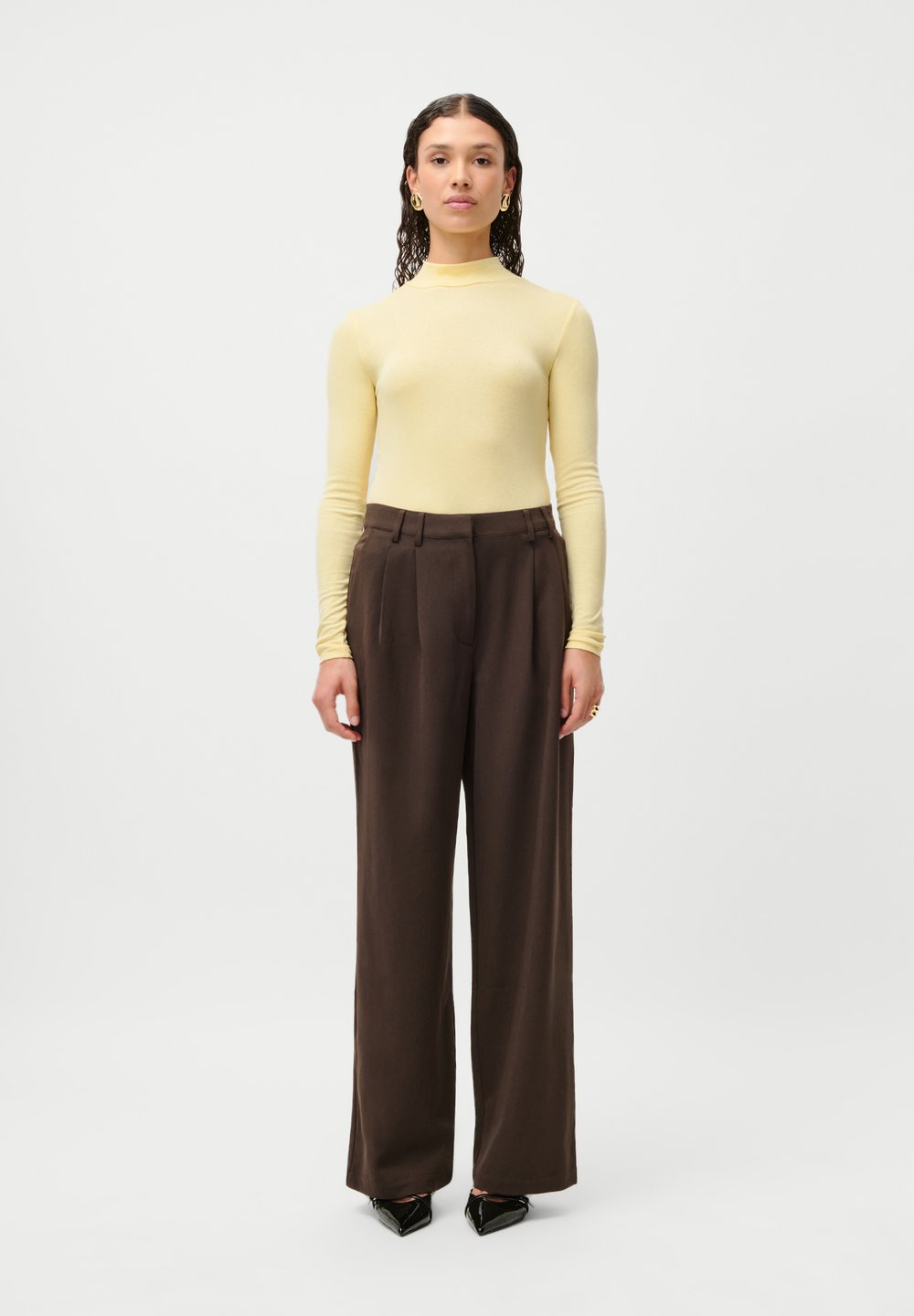 Completo due pezzi marrone su misura, con top senza spalline e bottoni e pantaloni a gamba larga. Completato da una piccola borsa nera.