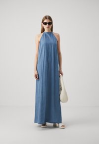 Giacca di jeans grigia, gonna maxi aderente blu, mocassini platform neri. L'outfit presenta un design semplice e un look casual. Pianta verde sullo sfondo.