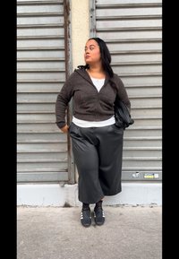 • Felpa con zip marrone in tessuto strutturato, indossata sopra una maglia bianca a coste, abbinata a pantaloni neri plissettati e a una borsa intrecciata nera.
