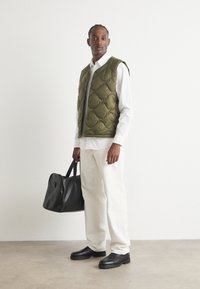 Gilet trapuntato verde oliva sopra una felpa grigia, pantaloni bianchi e sneakers nere. L'ambiente presenta pareti arancioni e colonne beige.