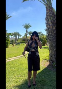 • Top a fascia con motivo floreale, pantaloni corti larghi neri, borsa nera e occhiali da sole. Erba verde e palme sullo sfondo.