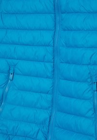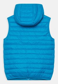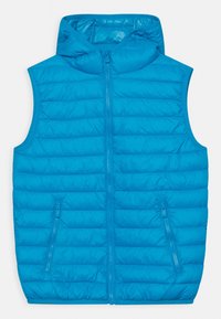 Smanicato imbottito blu con chiusura frontale a zip, cappuccio e due tasche laterali con zip. Presenta un design trapuntato e una texture del tessuto liscia e lucida.
