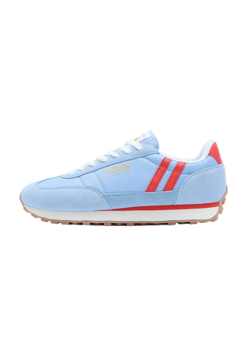 Sneaker Patrick Monza azzurro chiaro con strisce rosse, lacci bianchi e suola in gomma beige mostrata di profilo.