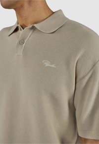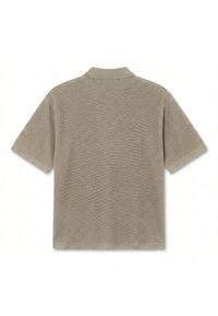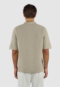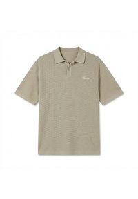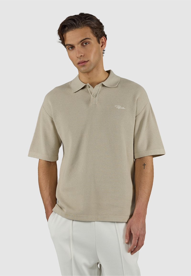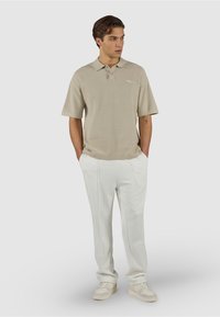 Giovane uomo con capelli corti e scuri, che indossa una polo beige in tessuto con trama e pantaloni bianchi, in piedi con una mano in tasca davanti a uno sfondo chiaro.