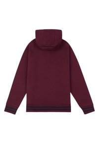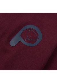 Felpa con cappuccio color bordeaux con finitura strutturata, dotata di coulisse nera con cursori regolabili e un grande logo di un orso blu sul petto.