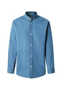Camicia in denim blu scuro con colletto a bottoni, tasca sul petto, e maniche arrotolate, caratterizzata da bottoni bianchi e una texture liscia.