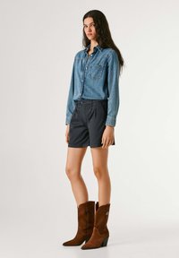 Persona che indossa pantaloncini neri, camicia di jeans a manica lunga e stivali da cowboy in camoscio marrone fino a metà polpaccio, in piedi contro uno sfondo semplice.