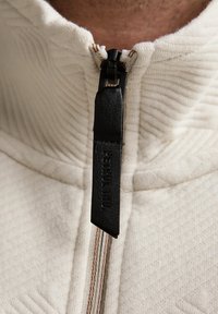 Giacca bianca con cerniera, motivo testurizzato, colletto alto e zip frontale. Decorata con un logo circolare sul petto. Tessuto morbido.