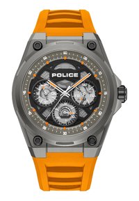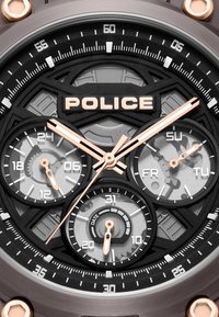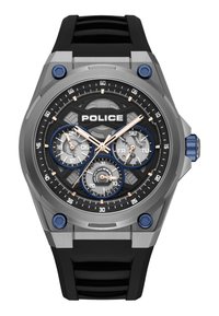 Polso con orologio Police nero a quadranti multipli, mano infilata nella tasca dei pantaloni chiari, con manica di maglione azzurro visibile.