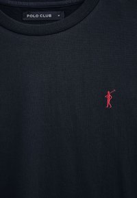 Maglietta nera a maniche lunghe con scollo rotondo, piccolo logo ricamato del giocatore di polo rosso sul lato sinistro del petto, polsini a costine e etichetta "Polo Club" all'interno del colletto.