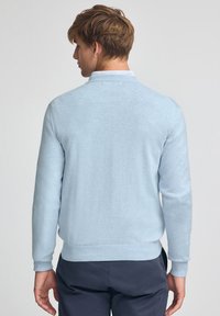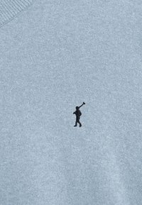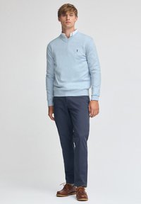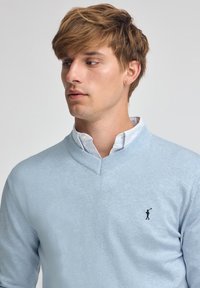 Maglione azzurro chiaro a scollo a V in morbido tessuto a maglia, con polsini e orlo a coste, e un piccolo logo ricamato sul petto.