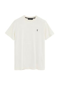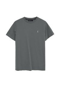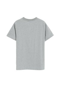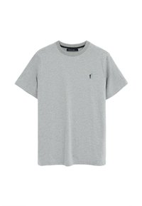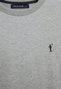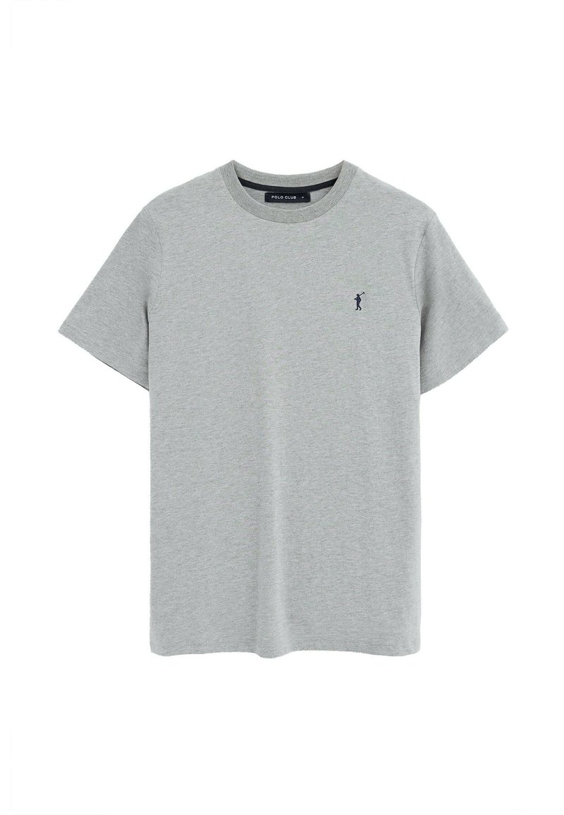 T-shirt grigio chiaro a maniche corte con scollo a girocollo e piccolo logo scuro di giocatore di polo sul petto a sinistra.