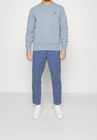 Persona che indossa una felpa a maniche lunghe di colore azzurro chiaro, con un piccolo logo scuro sul petto a sinistra, e pantaloni blu.