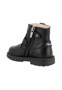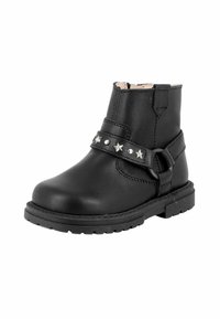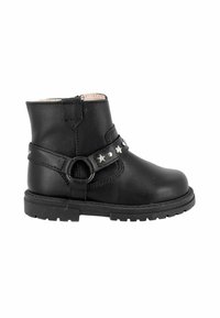 Stivale nero in pelle alla caviglia con punta rotonda, zip laterale e fascetta decorativa con borchie a forma di stella. Suola testurizzata per una migliore aderenza.