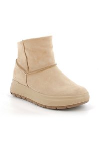 Stivaletti beige in suede con una morbida e soffice fodera, dotati di una suola a zeppa bassa e di un semplice design cucito lungo il lato.