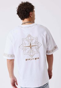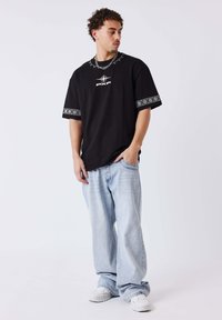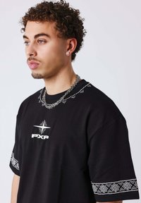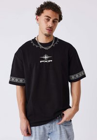 Giovane uomo che indossa una t-shirt nera oversize con design geometrico bianco a forma di stella e testo "PXP" sul retro, abbinata a jeans azzurri.