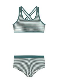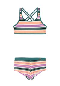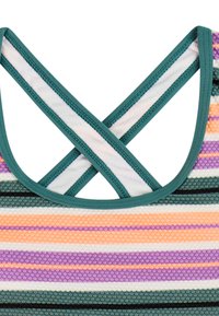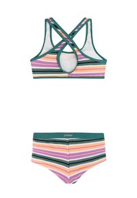 Costume da bagno a due pezzi con top sportivo corto bordato di verde e spalline incrociate, e slip a vita alta coordinati, entrambi con righe orizzontali multicolori.