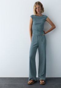 Giovane donna con capelli biondi che indossa un top azzurro chiaro senza maniche con trama e pantaloni abbinati con coulisse su uno sfondo semplice.