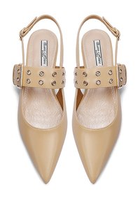 Ballerine beige a slingback con punta appuntita, fibbia decorativa di lato e suola piatta. Indossate con una gonna di pelle nera.