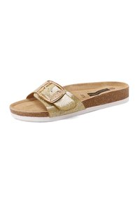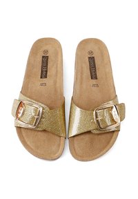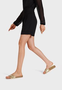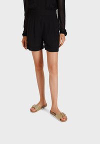 Shorts neri sartoriali con pinces e vita alta, abbinati a sandali dorati con fibbia decorativa e cinturini testurizzati.