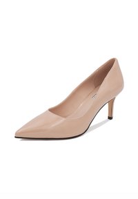 Décolleté in pelle lucida color nude con punta affilata, tacco a spillo di 3 pollici e dettagli con ritagli laterali. Tessuto liscio e design elegante.
