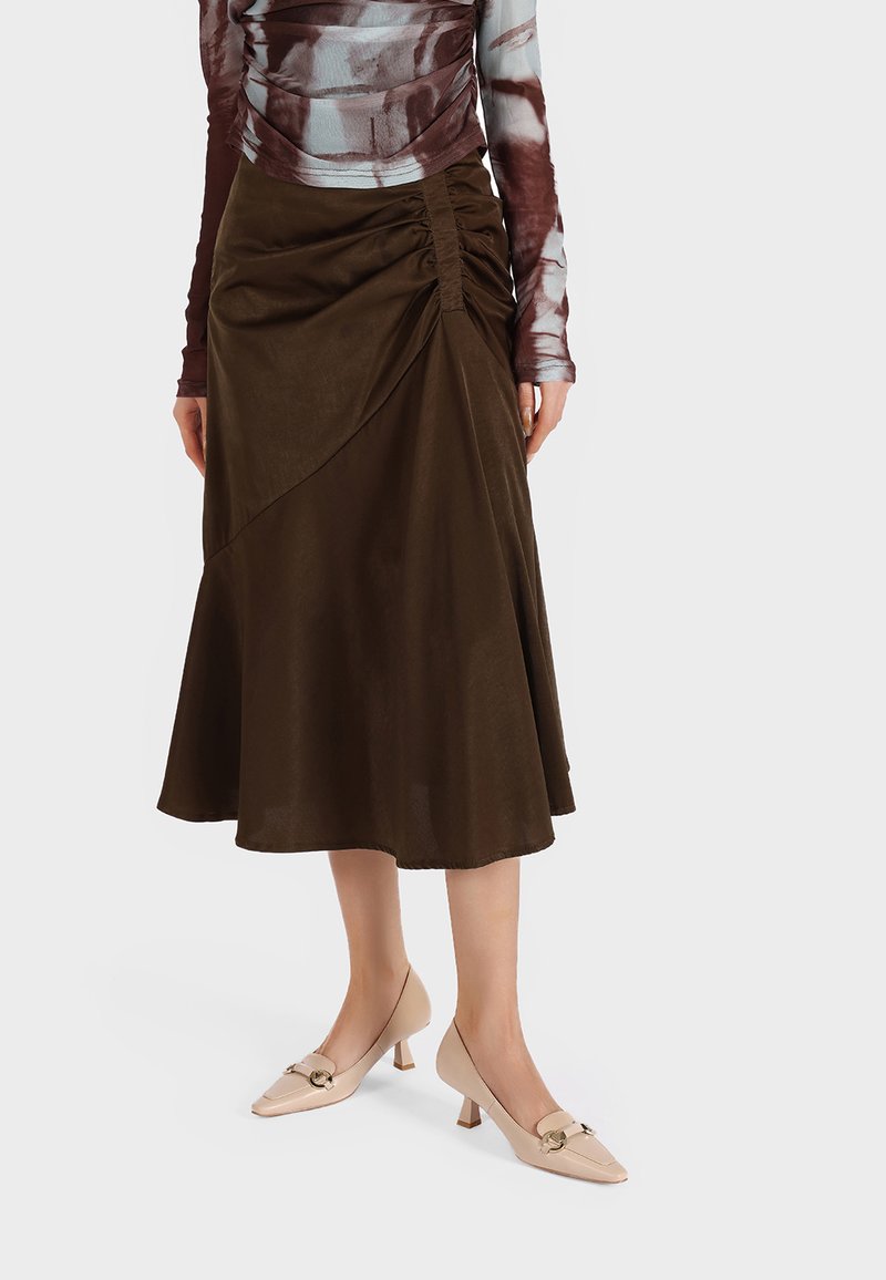 Gonna marrone fino al ginocchio con un design drappeggiato e arricciature laterali, abbinata a tacchi beige con tacco piccolo e dettagli decorativi.