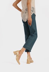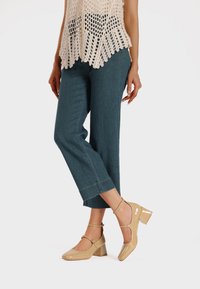 Décolleté in pelle verniciata beige con cinturino alla caviglia, punta quadrata e tacco spesso, abbinati a pantaloni cropped in denim blu. Top all'uncinetto con lavorazione aperta.