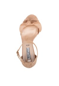 Sandali con tacco beige in morbida pelle scamosciata, design aperto sulle dita, con un dettaglio di fiocco decorativo sulla parte anteriore e una fibbia sulla caviglia.