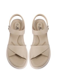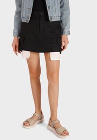 Mini gonna nera in cotone con tasche laterali, abbinata a sandali con zeppa beige con design a fascia incrociata e suola in gomma. Giacca di jeans sopra.