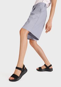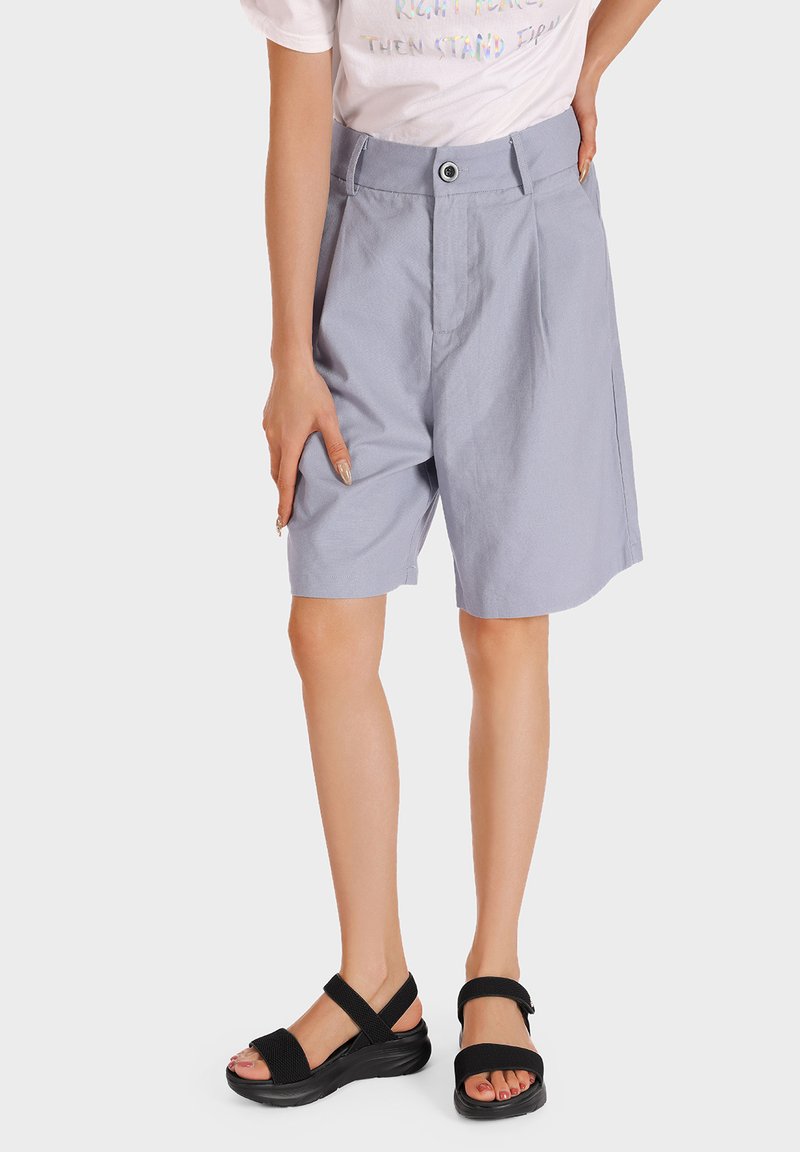 Pantaloni shorts grigi chiari con una vestibilità comoda, dotati di chiusura con bottone e tasche laterali, abbinati a sandali neri con cinturini regolabili.