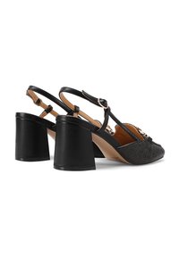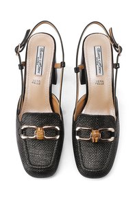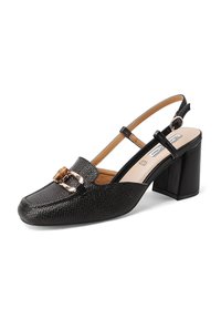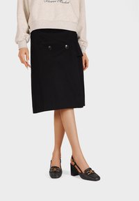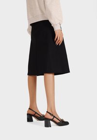 Gonna nera al ginocchio con doppio bottone frontale, abbinata a scarpe slingback nere con texture e dettagli dorati.