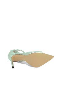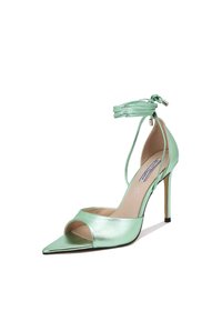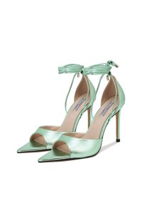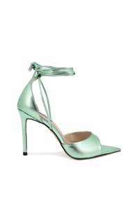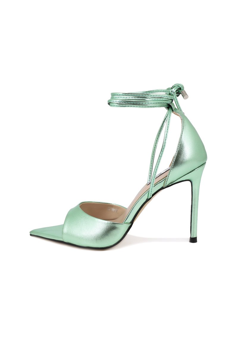 Sandal con tacco alto metallizzato verde menta, con punta quadrata, cinturino alla caviglia e tacco sottile. Texture liscia con finitura lucida.