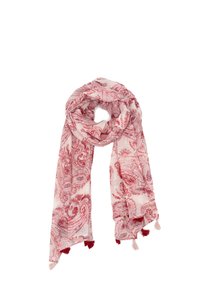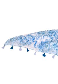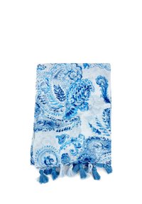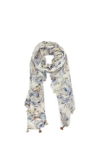 Sciarpa leggera di colore blu con motivo paisley, realizzata in tessuto morbido. Presenta delle frange alle estremità, ideale per un abbigliamento casual.
