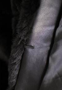 Cappotto trapuntato nero con vita regolabile, maniche in pelle e colletto alto. Presenta bottoni a pressione e una texture liscia. Abbinato a jeans scuri e scarpe con motivo.