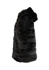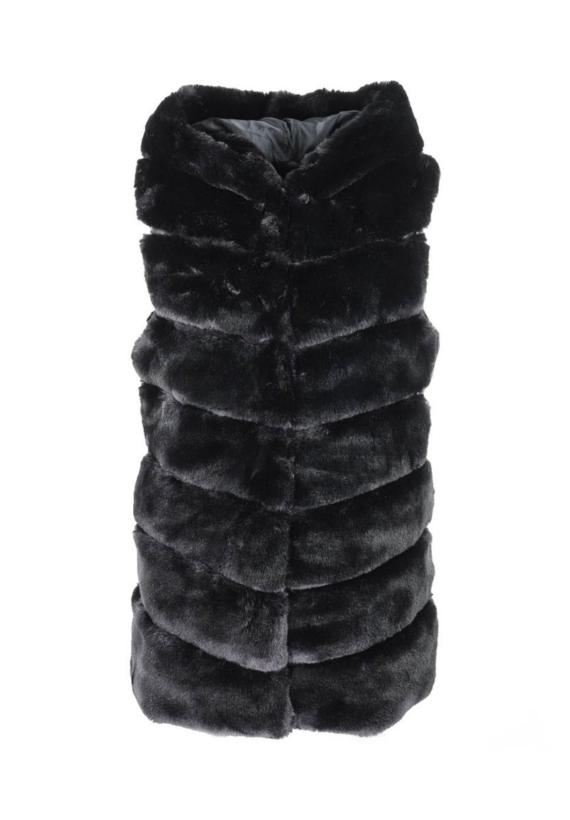 Gilet in pelliccia sintetica nera con un design lungo e fluente e una zip frontale. Indossato sopra un top nero a maniche lunghe e abbinato a stivali neri con lacci.