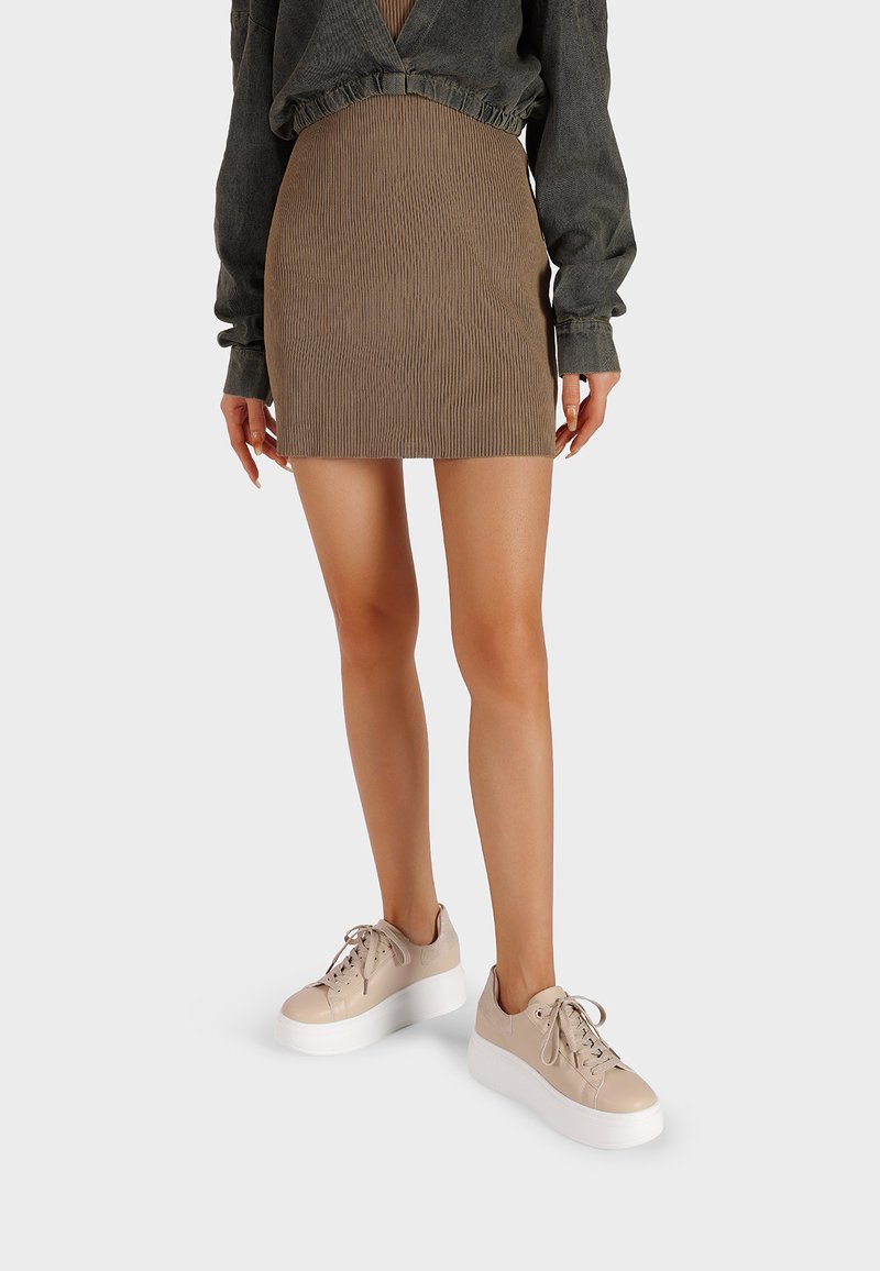 Gonna mini a coste marrone abbinata a un maglione corto verde scuro e sneakers beige con zeppa e suole e lacci bianchi.