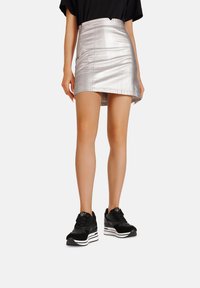 Gonna mini argentata metallizzata con un design aderente, caratterizzata da dettagli cuciti e un orlo dritto, abbinata a scarpe da ginnastica nere.