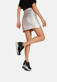 Mini gonna metallica argento con un design aderente, abbinata a sneakers nere massicce con dettagli bianchi e texture.