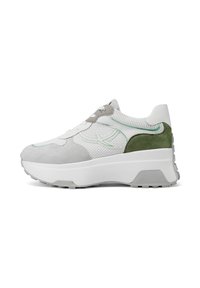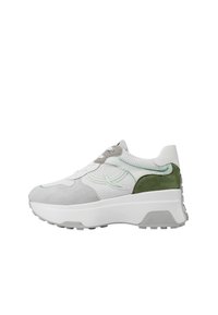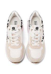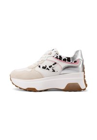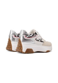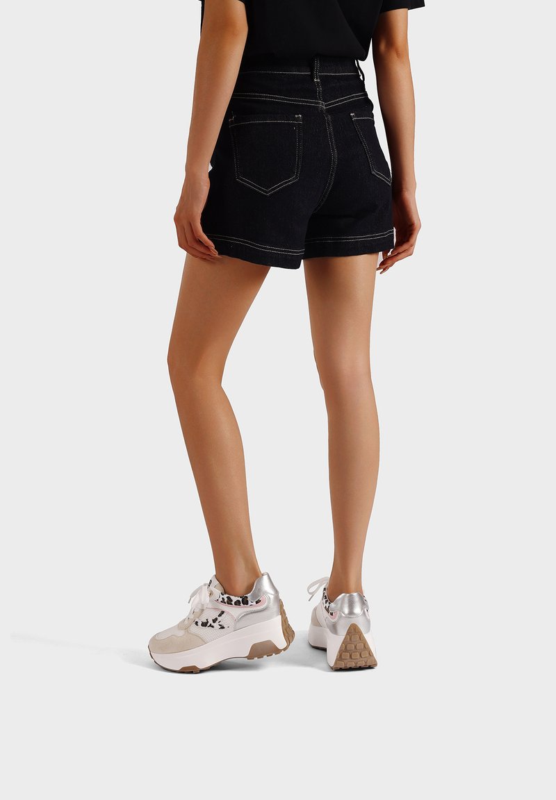 Persona che indossa pantaloncini di jeans neri e scarpe da ginnastica bianche con dettagli leopardati, in piedi davanti a uno sfondo grigio uniforme.