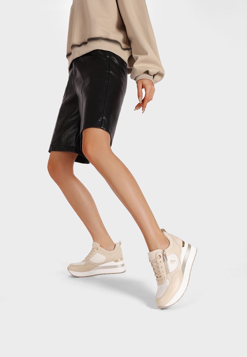 Sneakers atletici beige caratterizzati da una combinazione di tessuto morbido e pelle, con una suola bianca spessa e sottili dettagli dorati, che mostrano un design moderno.