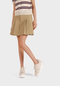 Gonna plissettata beige abbinata a sneakers platform bianche con texture liscia e design con lacci. Maglione a maniche corte a righe sopra.