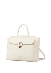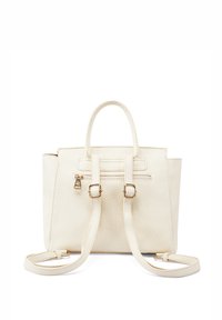 Zaino in pelle bianca texture con patta quadrata, hardware dorato e doppi manici superiori. Indossato sulla schiena sopra un maglione scuro.